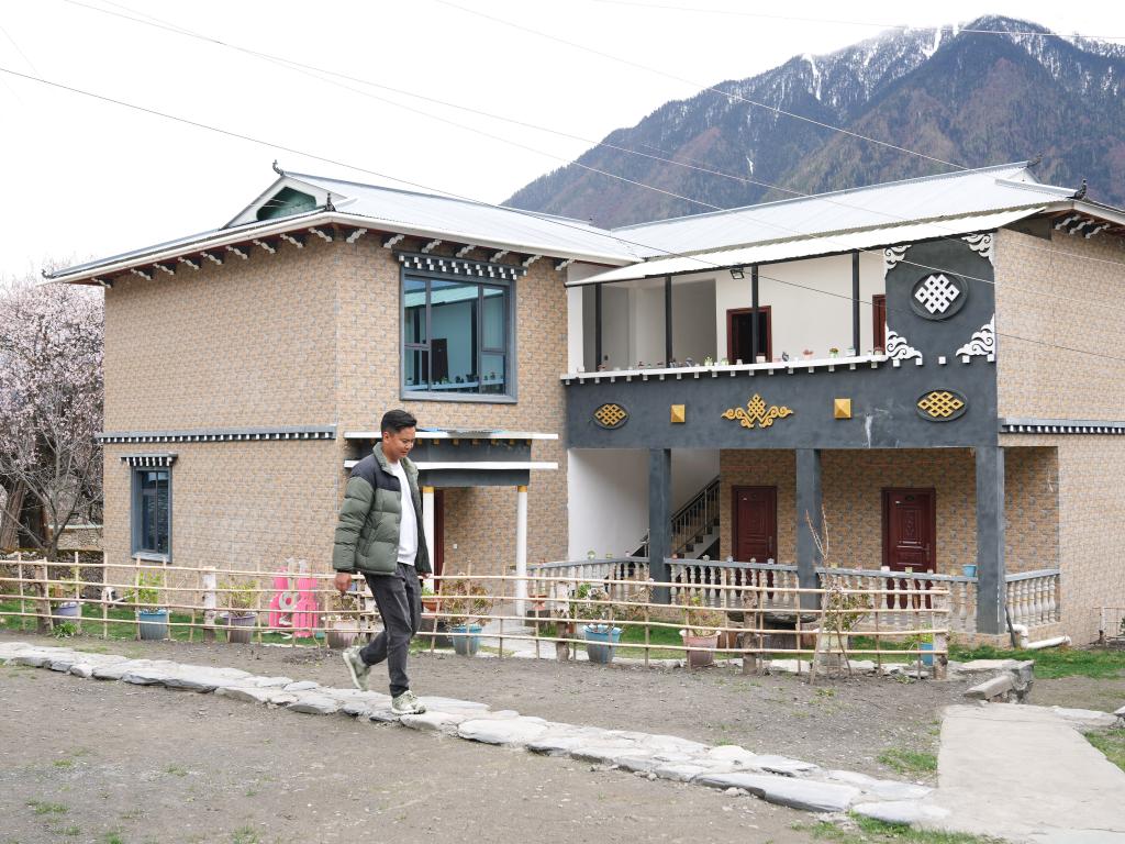 4月2日,洛松顿珠从自家民宿前经过。新华社记者 丁汀摄