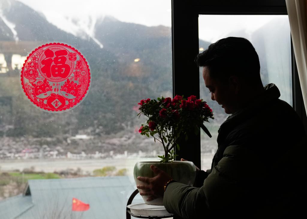 4月2日,洛松顿珠在自家民宿的客厅内整理盆栽。新华社记者 丁汀摄