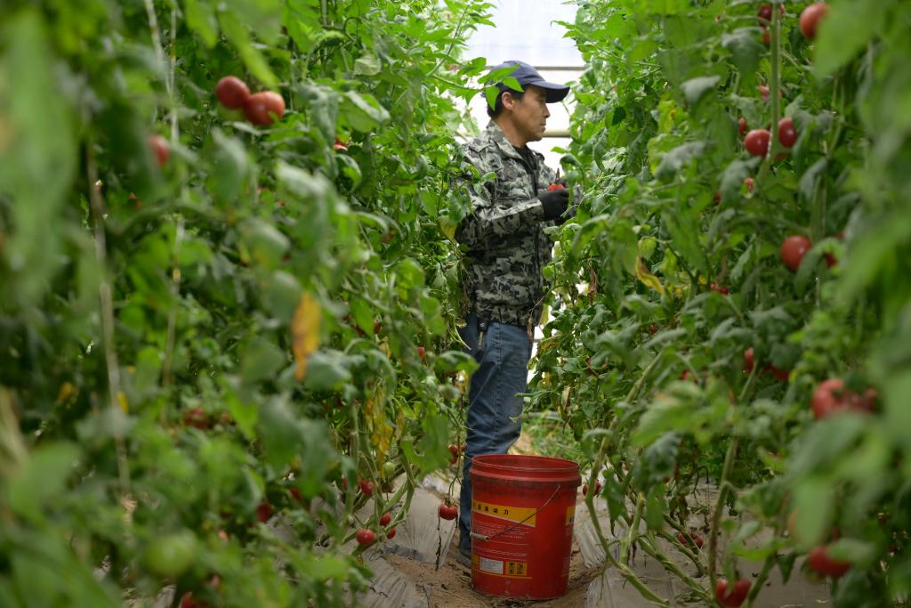 4月2日,在宁夏农垦集团连湖农场,农户在日光温棚采摘西红柿。新华社记者王鹏 摄