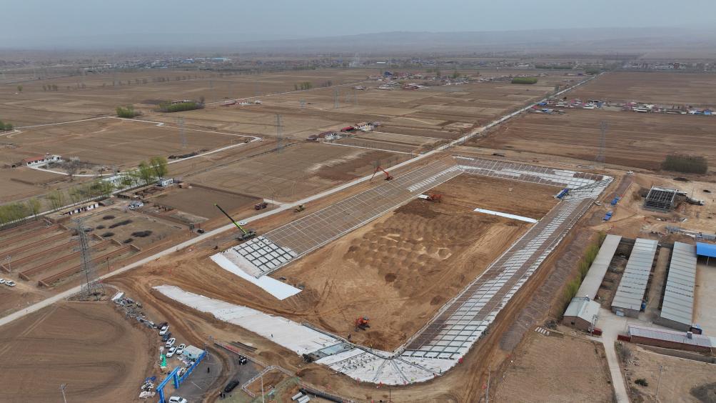 图为宁夏吴忠市同心县河西镇高效节水灌区建设俯瞰图,工人正在修建蓄水池。新华社记者王鹏 摄