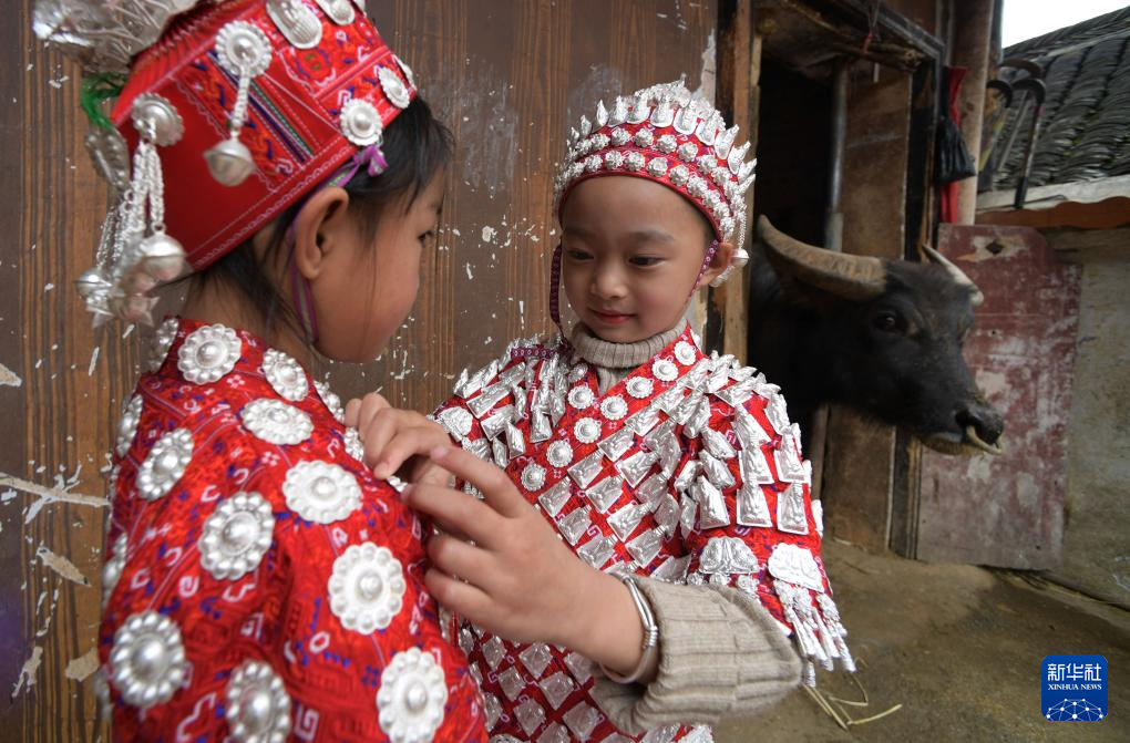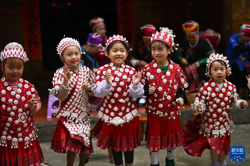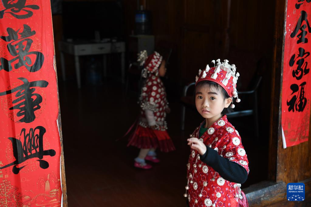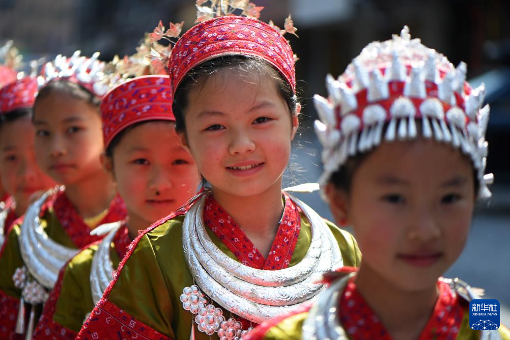 4月8日,盛装的小朋友在贵州省黄平县谷陇镇大寨村玩耍。