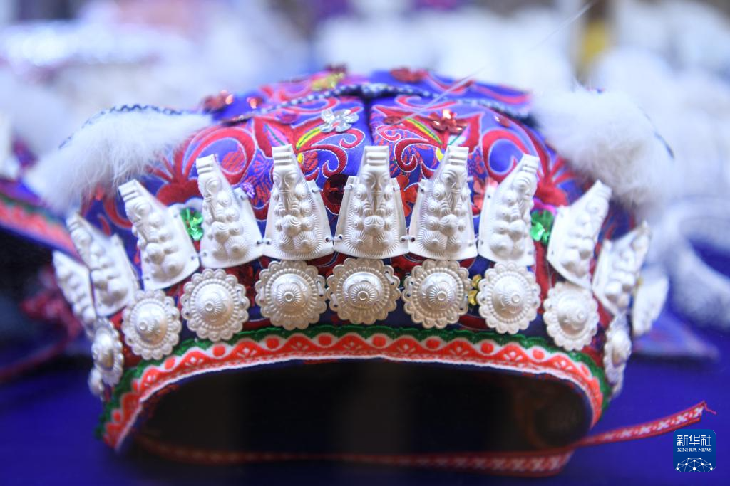 4月8日在贵州省黄平县谷陇镇一家银饰店拍摄的儿童银饰帽。