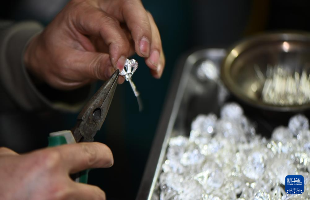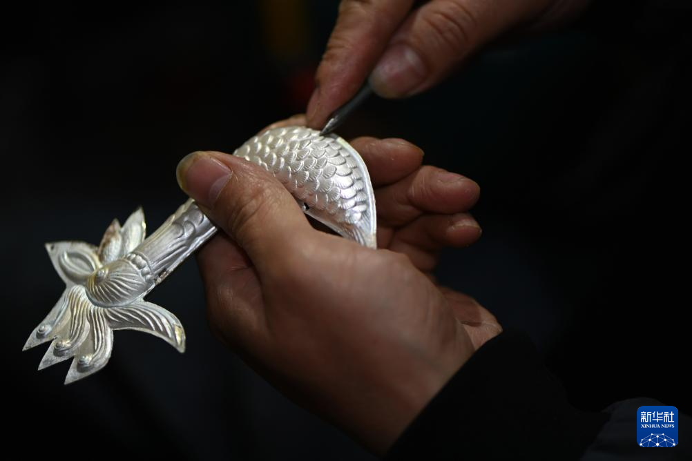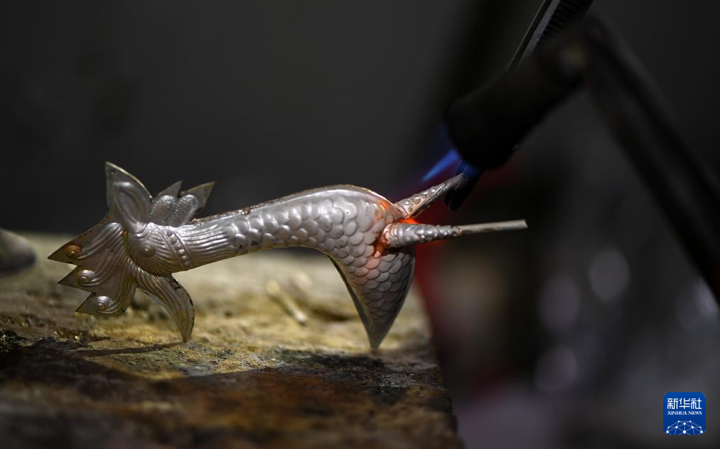 4月8日,手艺人在贵州省黄平县新州镇文星社区一家银饰店内制作银饰。