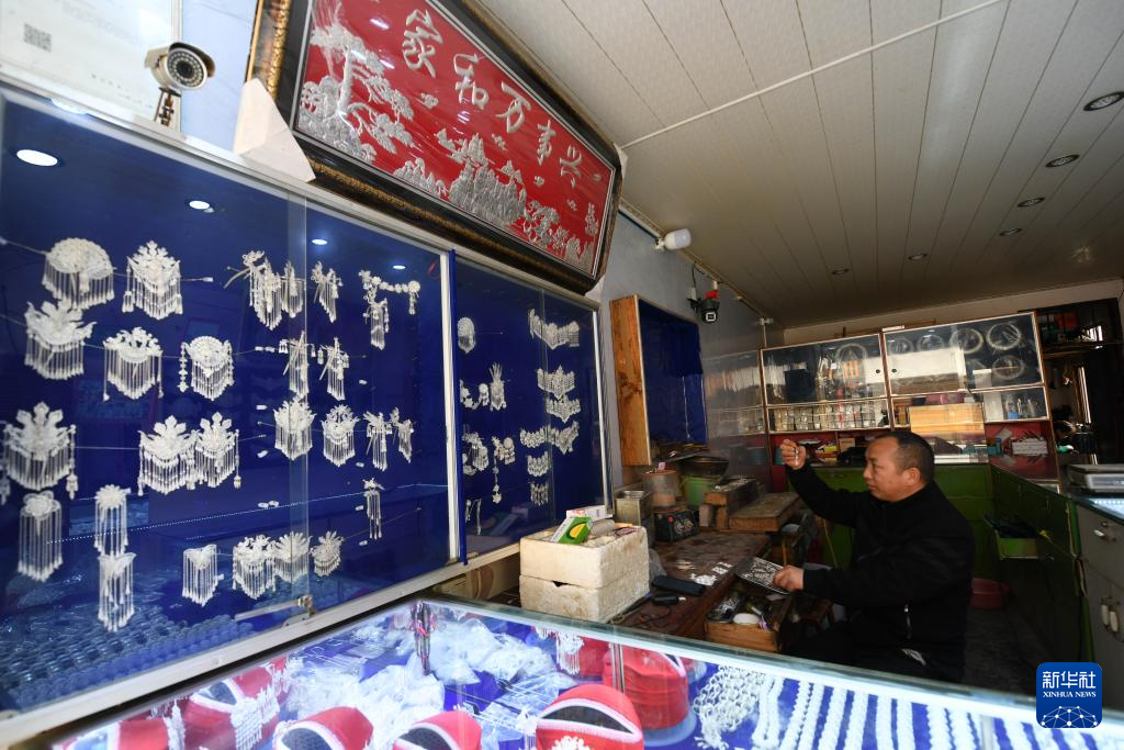 4月8日,手艺人在贵州省黄平县谷陇镇一家银饰店内制作银饰。