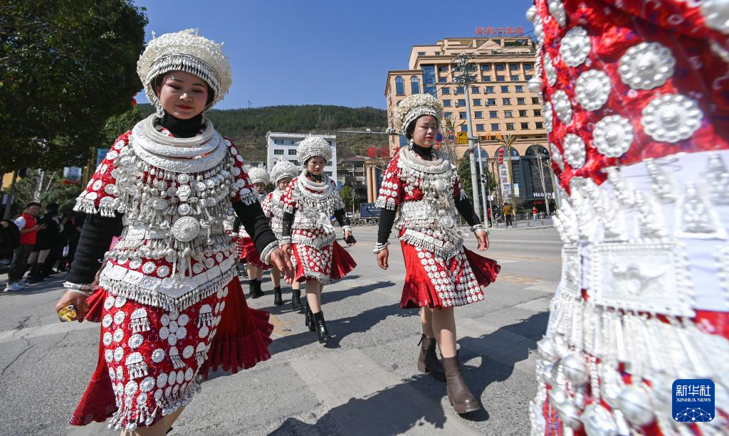 盛装的苗族群众参加贵州省黄平县在农历正月期间举行的巡游活动(2月18日摄)。