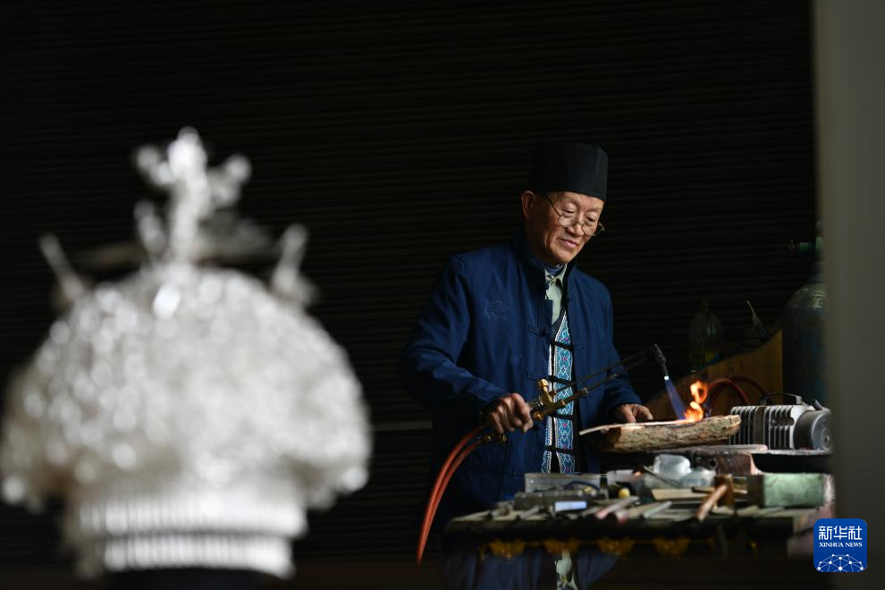 4月8日,在贵州省黄平县,国家级非遗项目苗族银饰制作技艺的代表性传承人杨正贵在自己的工作室中加工银饰。