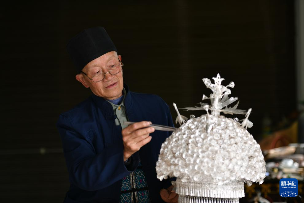 4月8日,在贵州省黄平县,国家级非遗项目苗族银饰制作技艺的代表性传承人杨正贵在自己的工作室中整理一件银帽。
