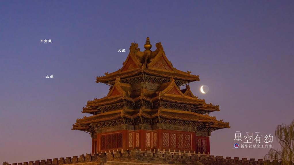 北京星空摄影爱好者吴鲁萍2022年3月28日清晨在北京拍摄的金星、火星、土星与残月。(本人供图)