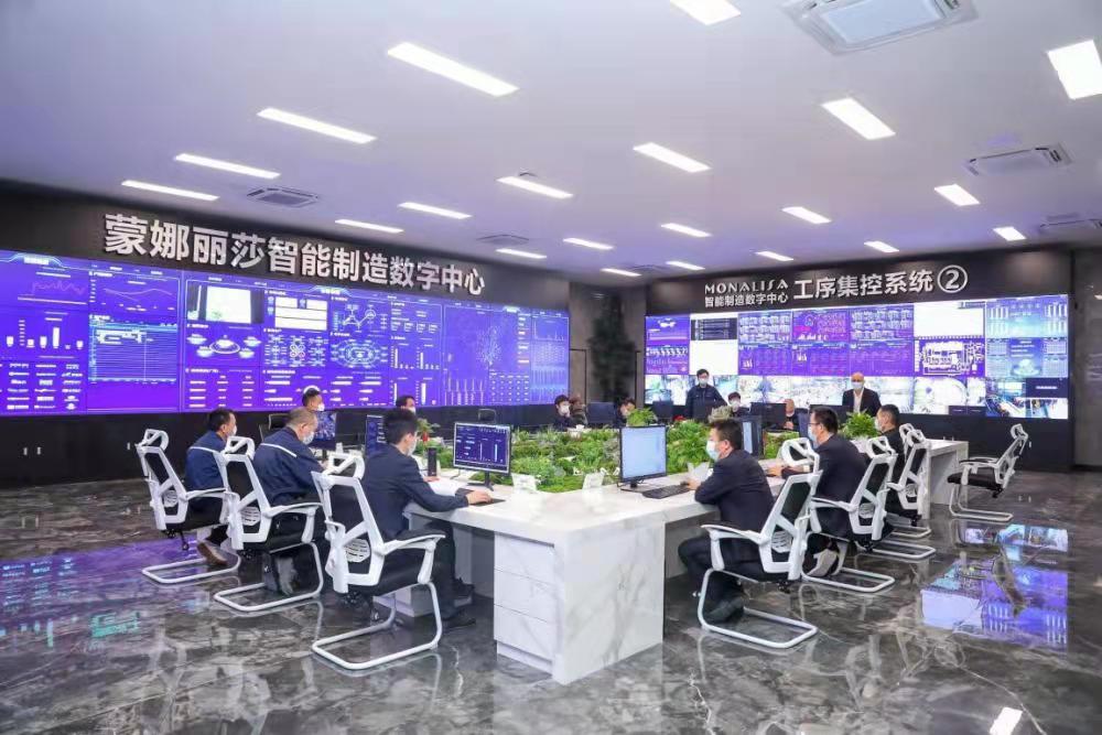 走进蒙娜丽莎的智能制造大数据中心平台,电子显示屏上可实时了解多个生产基地的产量、耗能、耗水、物流等数据,只需几名生产技术人员就可以实现对生产过程的可视化监管。