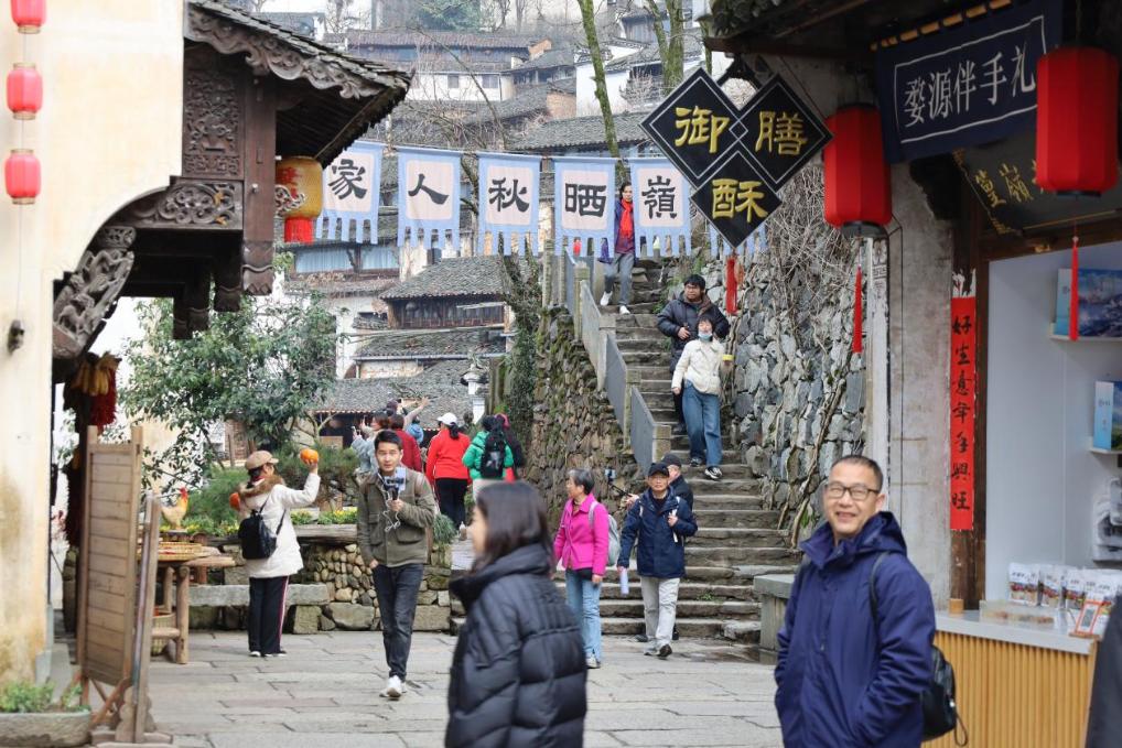 “2019年,我受景区邀请从浙江衢州来这边开店的时候,篁岭的乡村旅游已经很成熟了。”在篁岭天街经营小吃店的“翻饼哥”王廷飞说,“婺源的人文、自然风光都十分优美,天街的游客量也很大。在这里不仅能有比较好的收入,生活也十分舒适。”