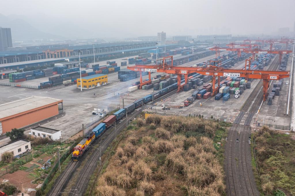 3月7日,一列满载机械设备、整车及零部件等货物的西部陆海新通道铁海联运班列从重庆团结村中心站驶出(无人机照片)。新华社记者黄伟 摄
