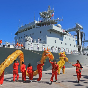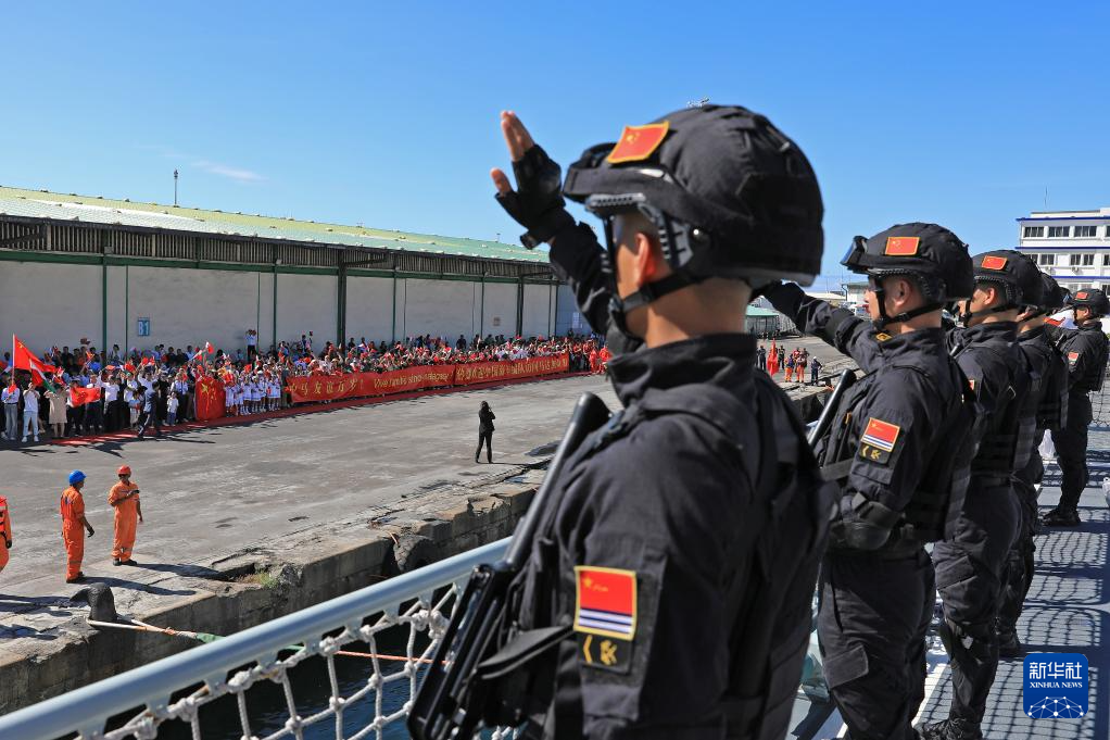 当地时间9时许,悬挂着中马两国国旗的编队舰艇乌鲁木齐舰、临沂舰和东平湖舰缓缓驶入马达加斯加图阿马西纳港。马达加斯加军方代表,中国驻马达加斯加大使馆工作人员、华侨华人等300余人到码头迎接。