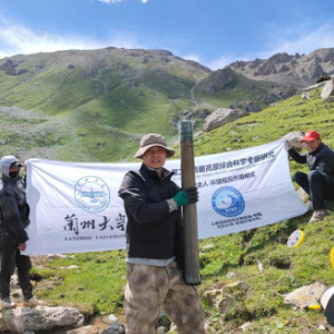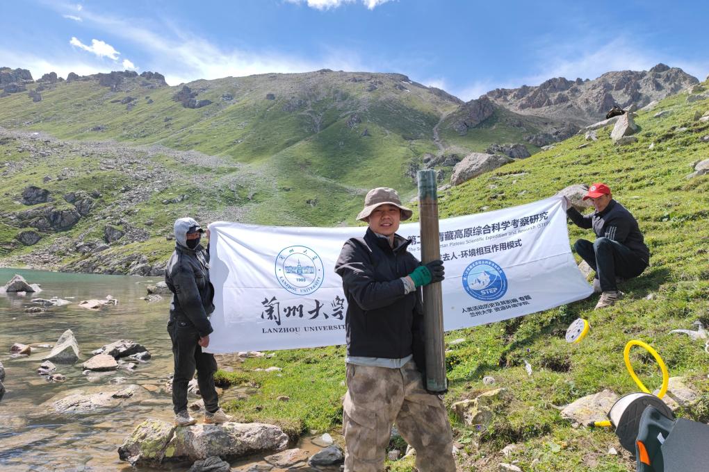 研究团队成员前往高山湖泊完成沉积物采样。(受访者供图)