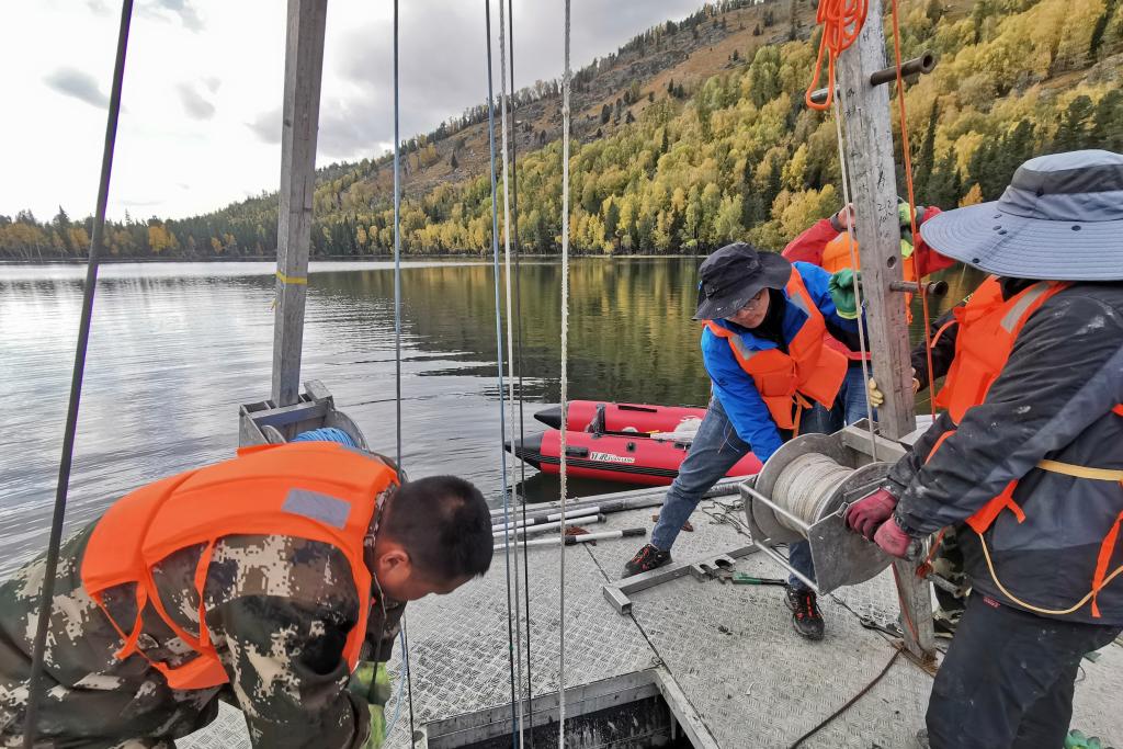 研究团队成员搭建浮台在湖心采集沉积物样品。(受访者供图)