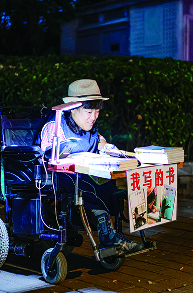 坐了几小时,一天的生意总算开了张。工作日的北京后海依然车马骈阗,驻足的人多,但买的人不多。洛洛的轮椅就是她的摊位。一块木板架在身前,出版的书整齐陈列两排。轮椅前一块白色纸板,上面4个醒目大字——“我写的书”。