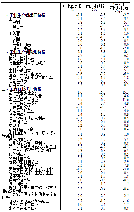 2024年3月份,全国工业生产者出厂价格同比下降2.8%,环比下降0.1%;工业生产者购进价格同比下降3.5%,环比下降0.1%。一季度,工业生产者出厂价格比上年同期下降2.7%,工业生产者购进价格下降3.4%。