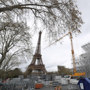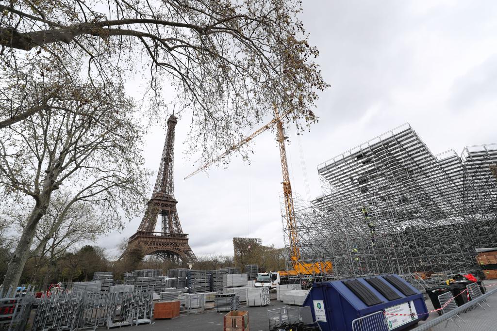 这是4月2日在法国巴黎埃菲尔铁塔附近战神广场拍摄的奥运比赛场地和看台建设工地。新华社记者高静摄