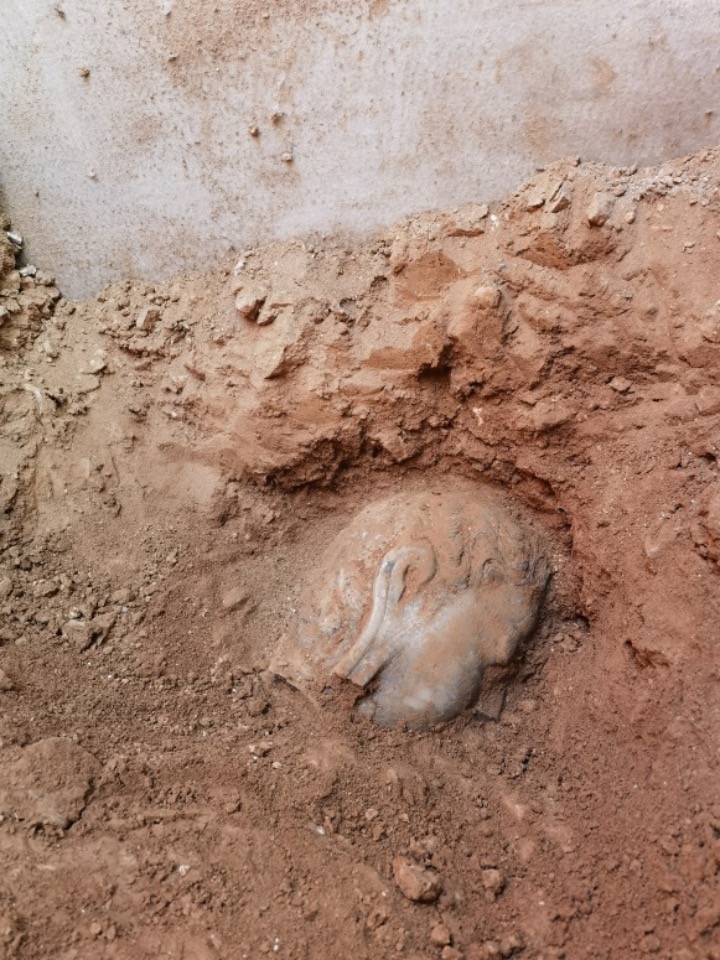 据了解,擂鼓台南洞前壁(西墙)由石块、青砖垒砌而成,厚度约1.3米。考古人员在墙的内部填土中,发现有遗物填充,经清理,这些遗物逐层摆放,垒砌于墙内。
