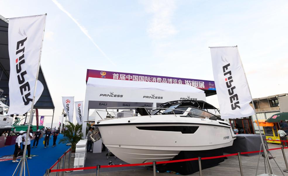 ↑首届消博会游艇展上展出的游艇。新华社记者杨冠宇摄