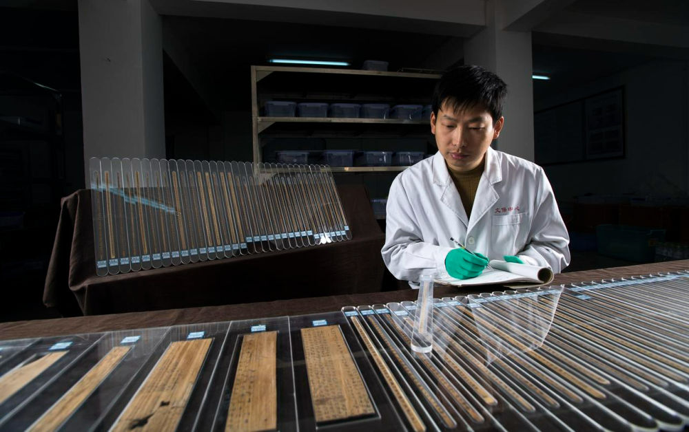 荆州文物保护中心工作人员对修复完成的简牍进行记录。(2017年3月16日 新华社记者熊琦 摄)