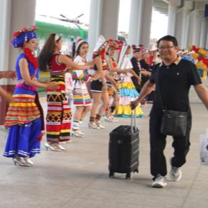 西双版纳站站台上,当地群众庆祝中国西双版纳至老挝琅勃拉邦开行国际旅客列车。(王一翔 摄)