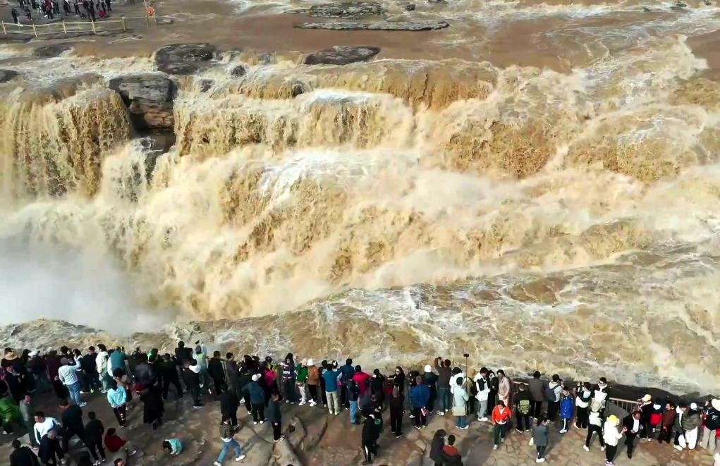 新华社太原4月13日电(记者王飞航)近日,随着气温回暖,受黄河上游冰凌消融的影响,位于山西吉县和陕西宜川县交界的黄河壶口瀑布迎来一年一度的“桃花汛”,瀑布水量骤然加大,如千军万马奔腾怒啸,蔚为壮观,吸引众多游客观看。