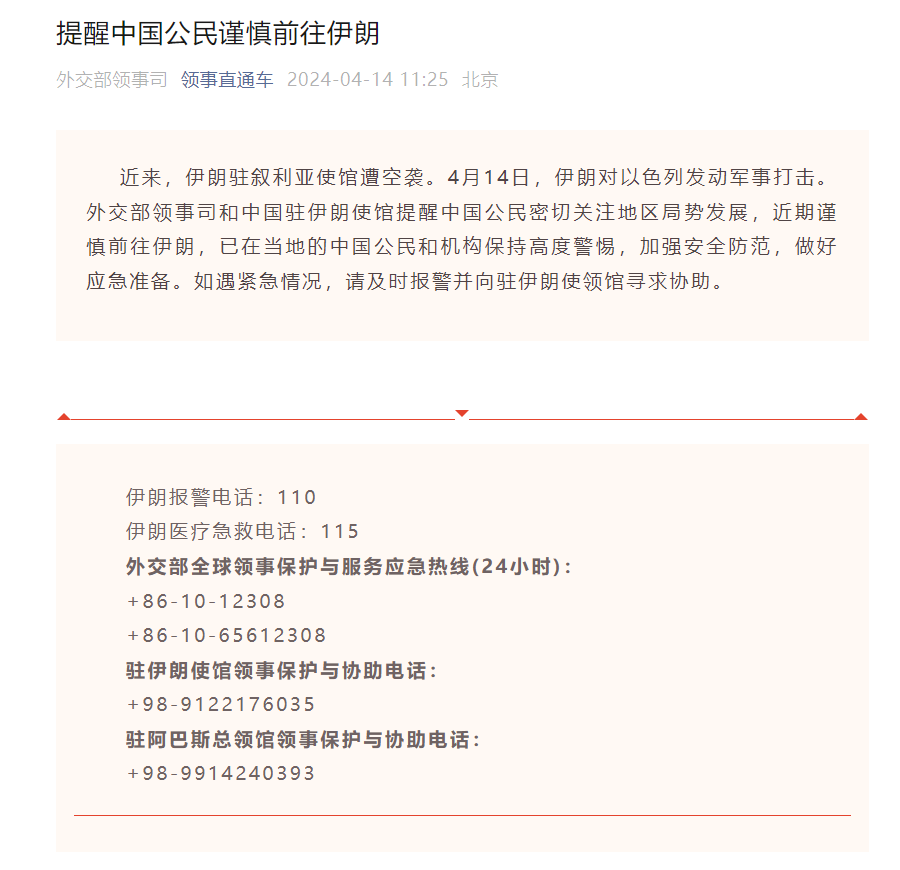 近来,伊朗驻叙利亚使馆遭空袭。4月14日,伊朗对以色列发动军事打击。外交部领事司和中国驻伊朗使馆提醒中国公民密切关注地区局势发展,近期谨慎前往伊朗,已在当地的中国公民和机构保持高度警惕,加强安全防范,做好应急准备。如遇紧急情况,请及时报警并向驻伊朗使领馆寻求协助。