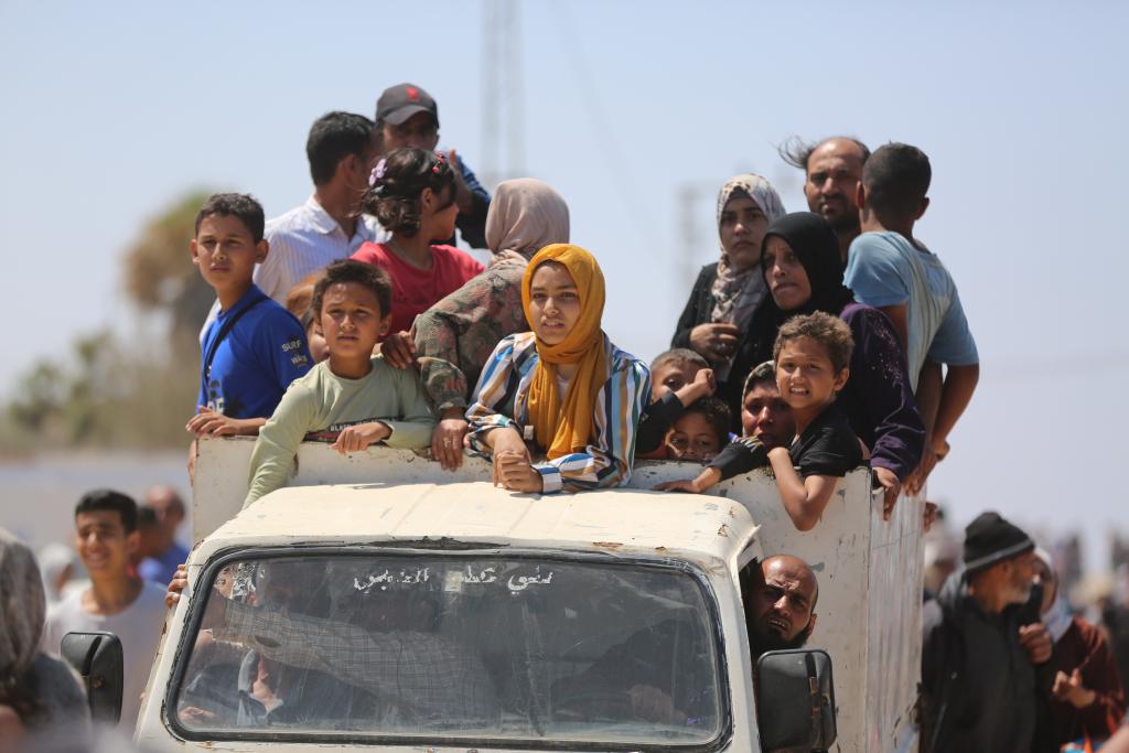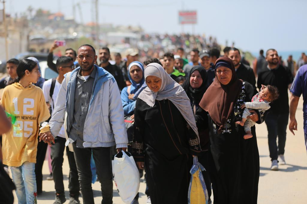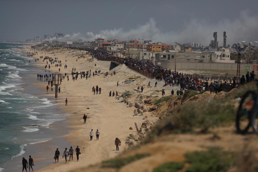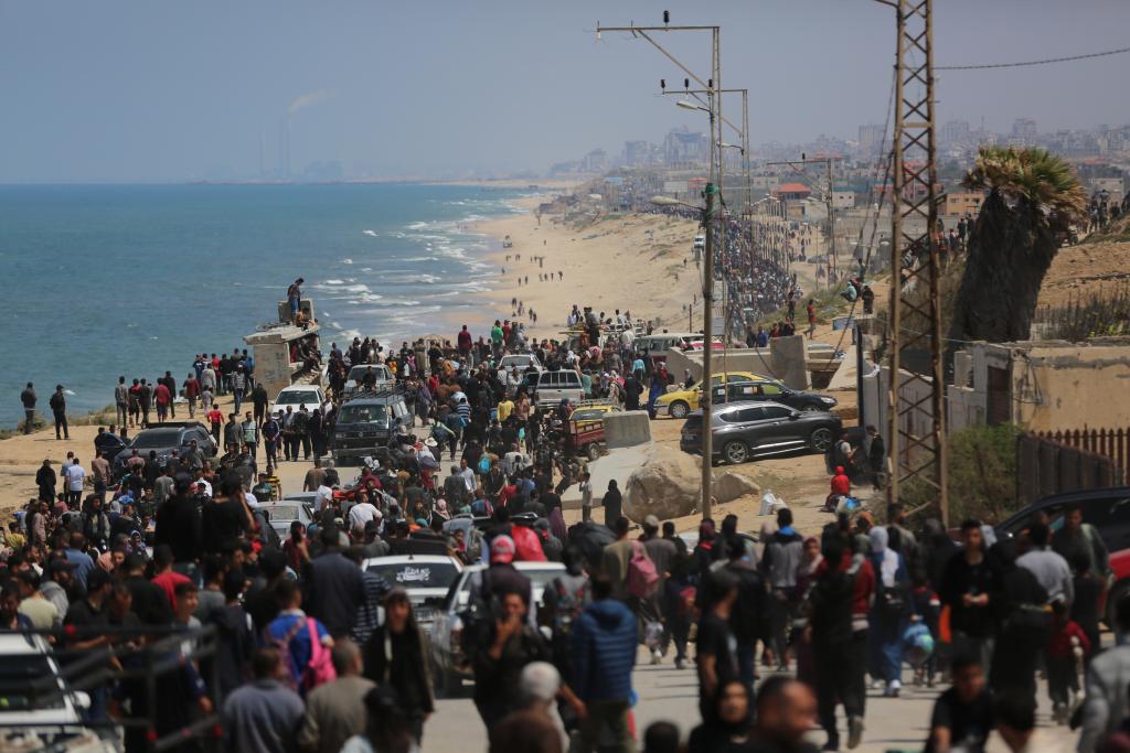 这是4月14日在加沙地带拉希德路中部路段拍摄的向北返家的人群。新华社发