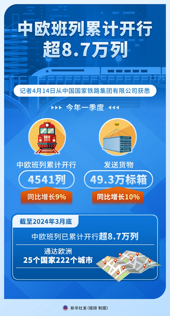 新华社北京4月14日电(记者樊曦)记者14日从中国国家铁路集团有限公司获悉,今年一季度,中欧班列累计开行4541列,发送货物49.3万标箱,同比分别增长9%、10%。截至2024年3月底,中欧班列已累计开行超8.7万列,通达欧洲25个国家222个城市。