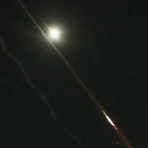 这是4月14日凌晨在耶路撒冷上空拍摄的以色列“铁穹”防空系统启动拦截的画面。
