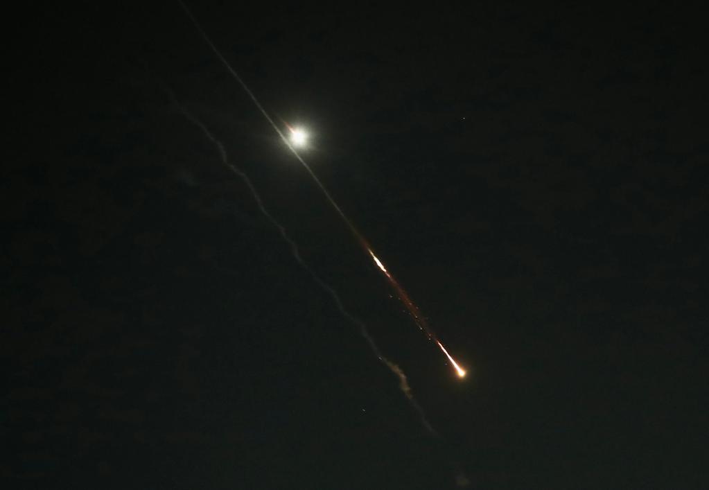 这是4月14日凌晨在耶路撒冷上空拍摄的以色列“铁穹”防空系统启动拦截的画面。新华社发(贾马尔·阿瓦德摄)