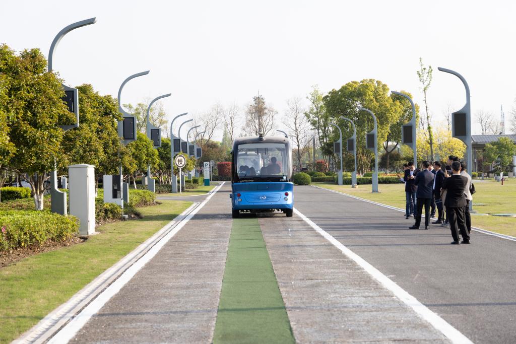 4月9日,在同里古镇北边的区域能源互联网示范区内,一辆无人驾驶巴士正行驶在路面光伏发电、动态无线充电和无人驾驶三项技术融合应用的“三合一”电子公路上。新华社记者金立旺 摄