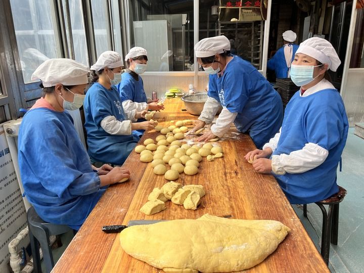 润明饼业的工人们正在制作传统糕点制品。