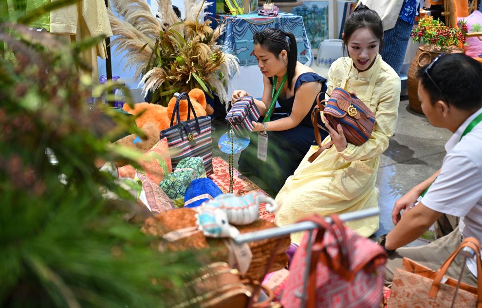 4月13日,观众在消博会现场选购设计融入海南黎族服饰元素的生活用品。新华社记者 郭程 摄
