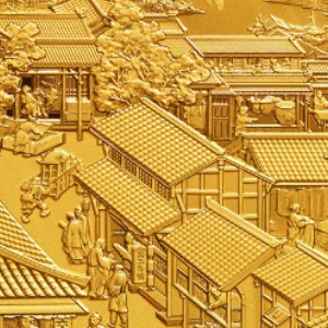 该套纪念币正面图案均为中华人民共和国国徽,并刊国名、年号。其中,150克长方形金质纪念币背面图案为北宋成都典型市井街巷、商贸活动场景及地域特色景观等组合设计,并刊“中国纸币千年”字样及面额。150克长方形金质纪念币最大发行量500枚。