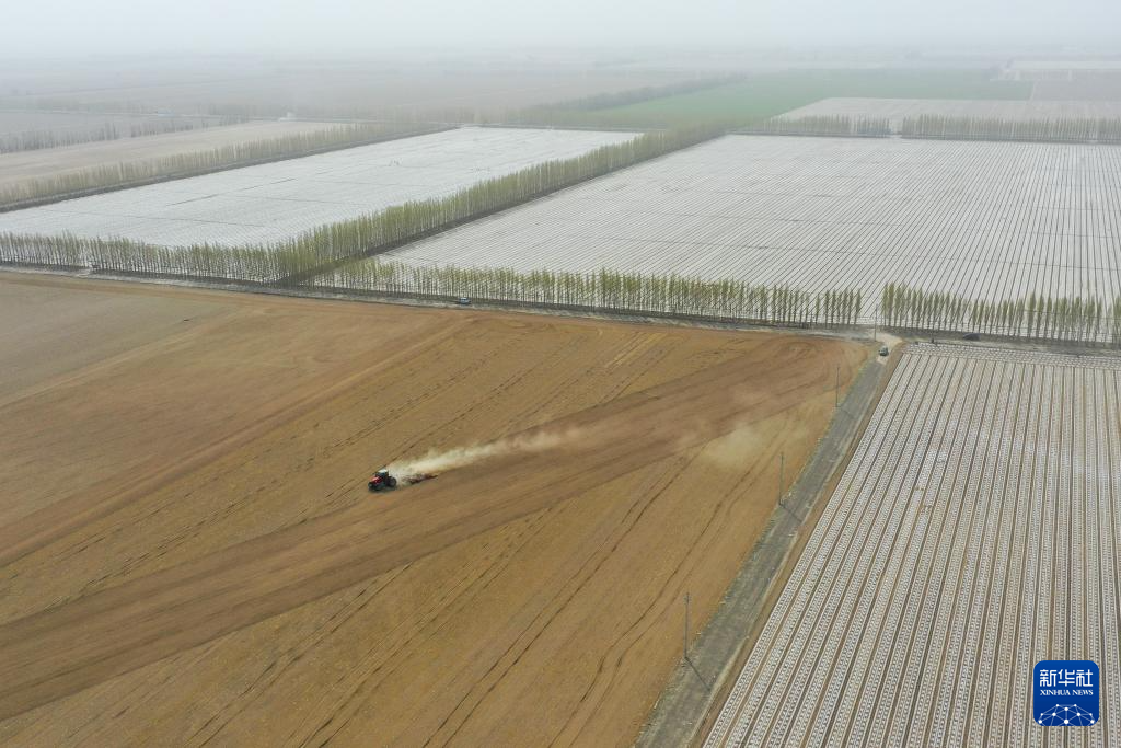 大马力拖拉机轰隆隆地驶过田野,一行行明晃晃的地膜笔直向前延伸,各种颜色的棉花种子被播进地里,一道道滴灌带跟着播种机铺设延展……