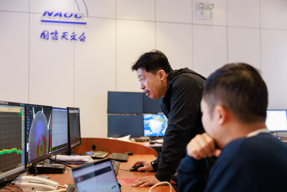 FAST运行和发展中心常务副主任、总工程师姜鹏(左)在总控室内观察设备运行状况(2024年3月20日摄)。新华社记者 刘续 摄
