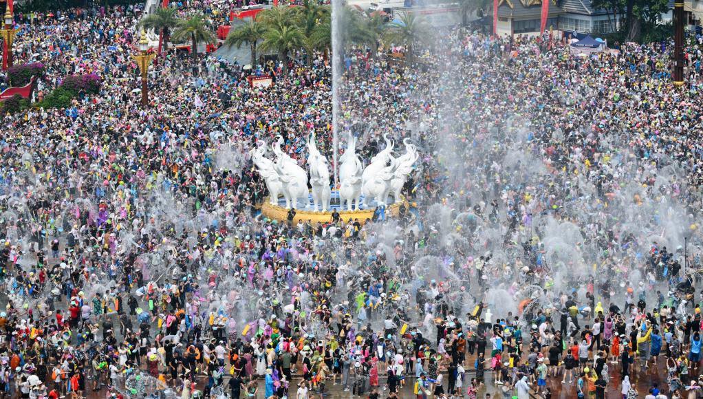 4月15日,人们在云南省西双版纳傣族自治州景洪市泼水广场上参加泼水狂欢活动。新华社记者 王静颐 摄