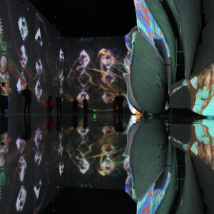 约1500平方米的沉浸体验展陈空间内,中国石窟艺术所承载的审美追求、价值理念、文化韵味得到充分彰显。敦煌莫高窟藻井、平棋、壁画边饰等的装饰纹样,经过图案数据的分类提取、叠加重组,形成动态纹样旋涡,好似一个万花筒。龙门石窟内碑刻造像题记上的魏碑书法精华“龙门二十品”,经过AI算法和AR红外触发技术处理,观众用手“拍一拍”就能生成甲骨文、金文、隶书、草书和行书等多种字体。