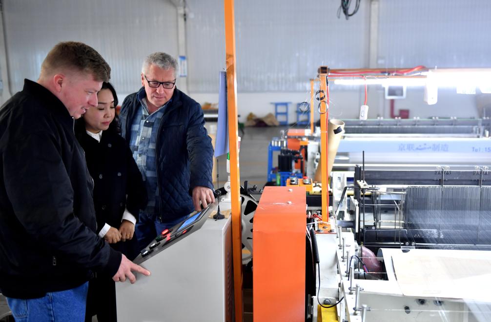 3月19日,外国客商在河北省衡水市安平县一家丝网企业了解产品生产情况。新华社记者 王晓 摄
