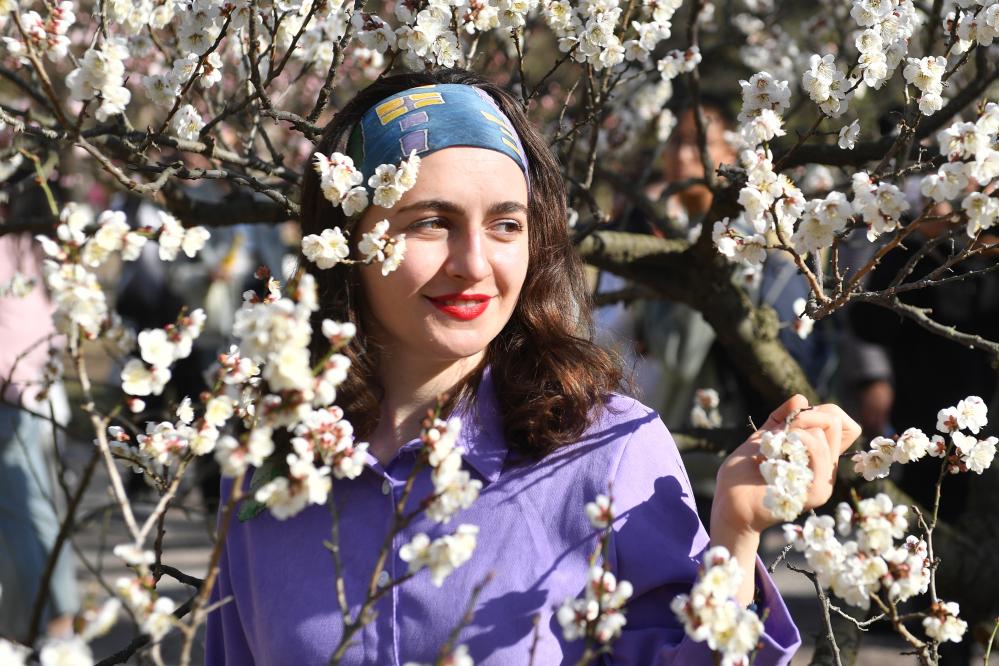 3月30日,一名外国游客在山东省青岛市中山公园梅园拍照打卡。 新华社发(王海滨 摄)