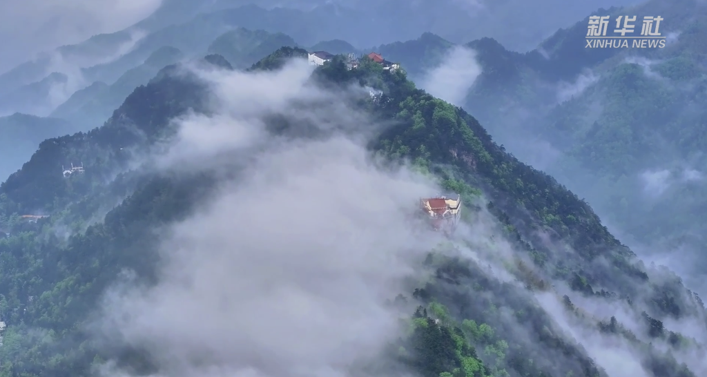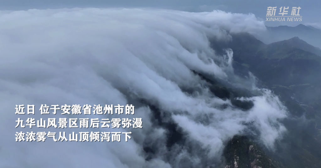 近日,位于安徽省池州市的九华山风景区雨后云雾弥漫,浓浓雾气从山顶倾泻而下,似白浪奔涌。