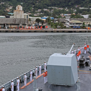 4月18日,中国海军第45批护航编队抵达塞舌尔维多利亚港。新华社发(王远方摄)