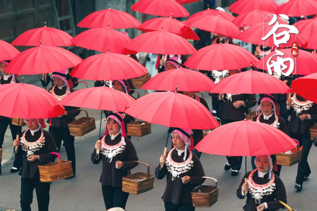 ↑湖南省怀化市通道侗族自治县牙屯堡镇,当地群众盛装游行前往大戊梁文化广场。CICPHOTO/粟勇主 摄