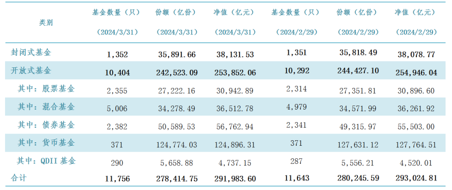 中国基金业协会日前发布的数据显示,截至2024年3月底,我国境内公募基金资产净值规模为29.20万亿元。