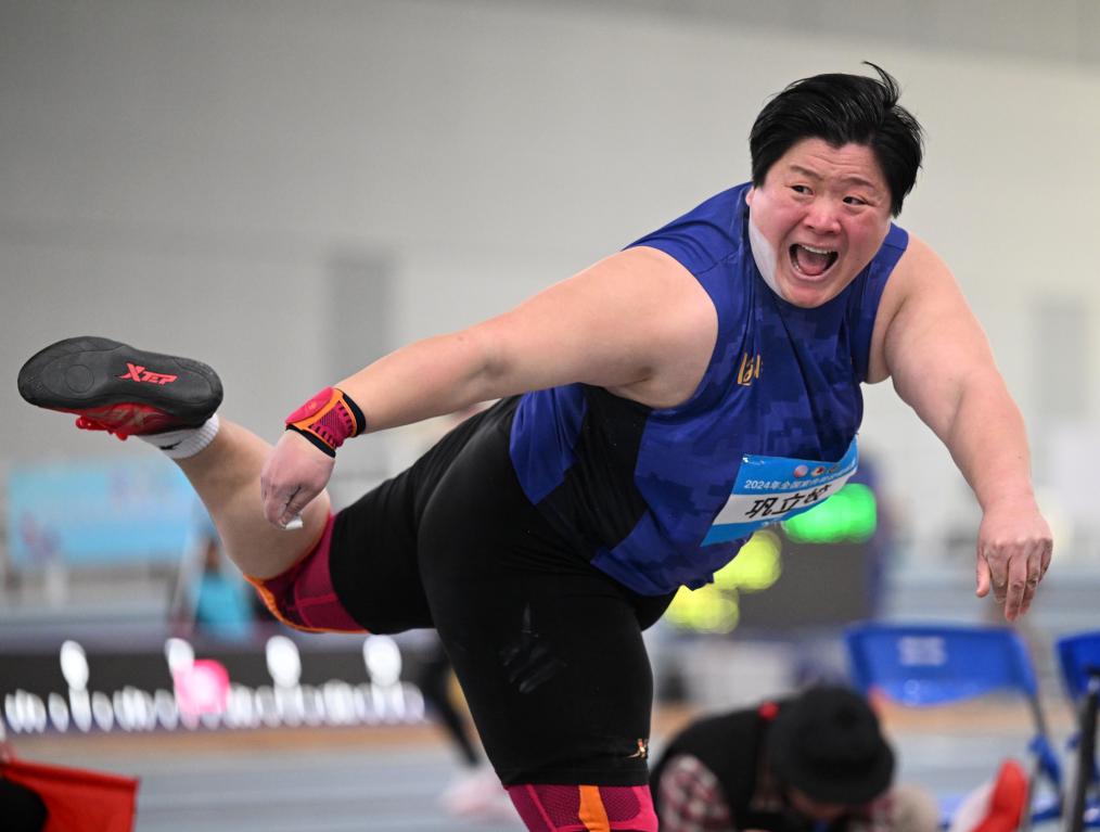 ↑3月29日,巩立姣在2024年全国室内田径锦标赛女子铅球决赛中以19米35的成绩获得冠军。新华社记者 赵子硕 摄