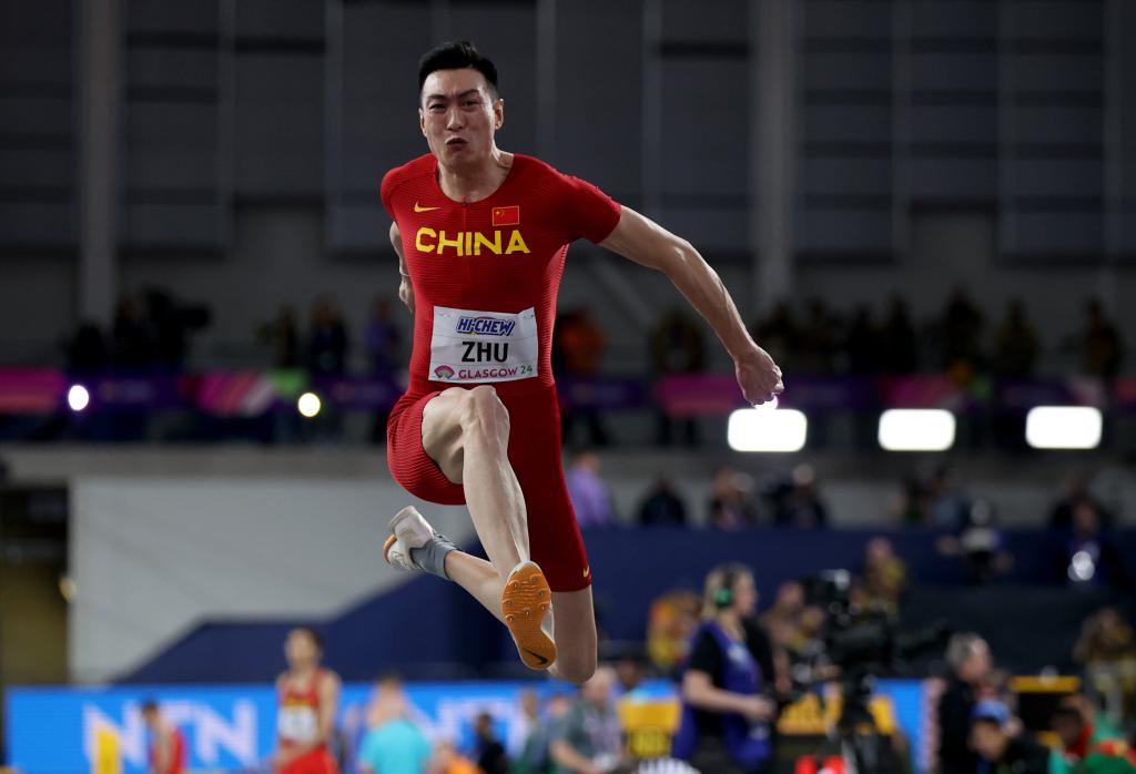 ↑3月2日,朱亚明在2024年室内田径世锦赛男子三级跳远决赛中试跳。新华社记者 李颖 摄