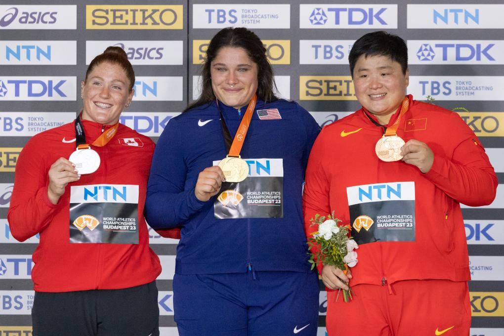 ↑2023年8月27日,冠军美国选手伊利(中)、亚军加拿大选手米顿(左)、季军中国选手巩立姣在世界田径锦标赛女子铅球颁奖仪式上合影。新华社发(弗尔季·奥蒂洛摄)