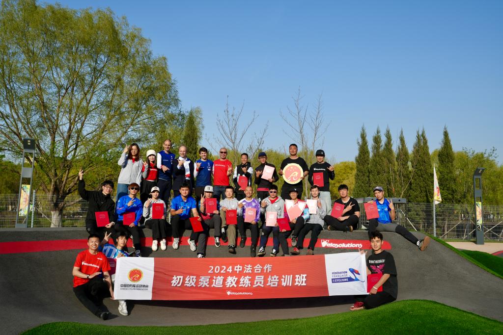 图为2024中法合作初级泵道教练员培训班结业照片,由中国自行车运动协会、法国自行车协会、Velosolutions中国联合主办并颁发培训结业证书。(受访者供图)