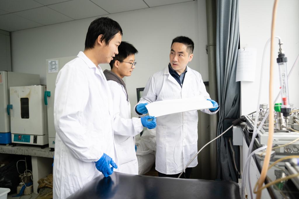 4月17日,南京理工大学环境与生物工程学院张轩教授(右)和学生研究新型聚酯反渗透膜。(张俊 摄)